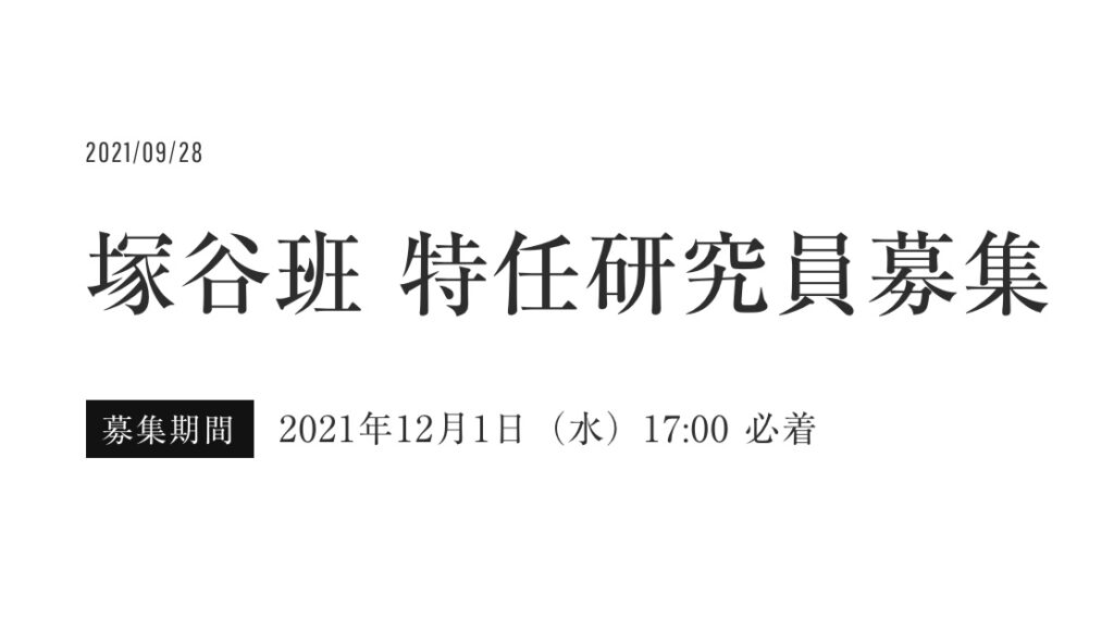 [再掲]塚谷研では特任研究員1名を募集していますMisc. 当研究室では、シロイヌナズナやゼニゴケなどのモデル植物に加え、無限葉植物、ミズハコベ、多肉植物、アリ植物、アンボレラなど多様な特性をもつ非モデル植物を用いて、植物の葉の発生の基本メカニズムとその多様性の理解を中心に据えた、幅広い研究を展開しております。この度の公募では、塚谷教授や研究室のメンバーと協力し、精力的にそれらの課題を進めてくださる方、また大学院生の教育研究にも関心を持って研究活動を行なってくださる方を募集致します。 詳しくはこちらをご覧ください
