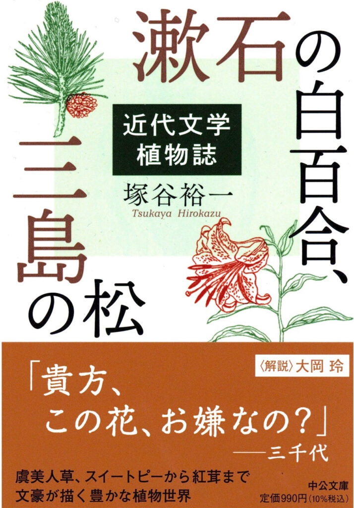 塚谷教授がそのむかし大学院修了とともに出した初のエッセイ集『漱石の白くない白百合』、これをもとに内容を一部入れ替え再編成した本『漱石の白百合、三島の松』が、中公文庫に加わりました。内容は副題の通りの、「近代文学博物誌」。大岡玲氏が解説を担当されています。
