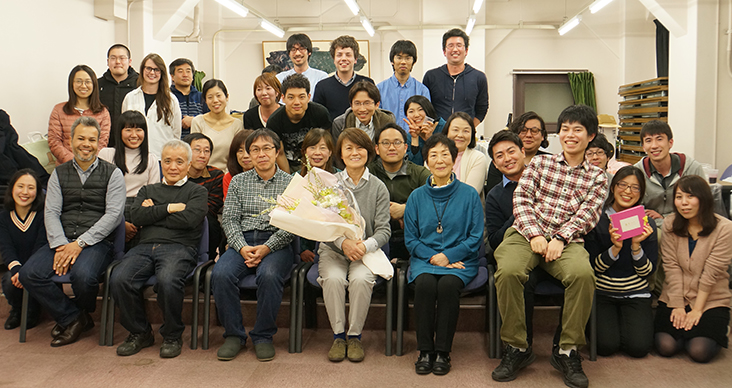 長年、ラボの秘書を務めてくださった藤島さんが定年でお辞めになるということで、昔のメンバー、近隣のラボの方々も含めて、多くの人が感謝祭に参集しました。参加者が持ち寄った、あるいは遠くから送ってくださった日本酒もずらりと並ぶ中、みんなで謝意をお伝えしました。本当に長いこと、ご尽力ありがとうございました。