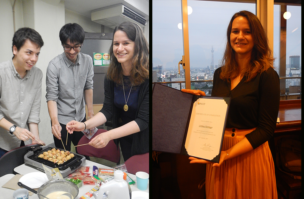 落ち着いた物腰できれいに仕事をまとめていき、そのプレゼンテーション技能のすばらしさには、ラボ一同感嘆しました。左は歓迎パーティーでたこ焼きを実践中の光景、右はプログラム最終日、修了証を手にした姿です。