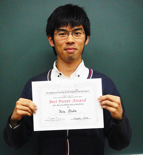 5月、船堀タウンホールで開かれた日本発生生物学会の50周年記念大会で、修士課程の大塚君がポスター賞を受賞しました。葉のねじれ運動に関する解析についての発表です。卒研時代からとはいえ、まだ実質的には始まったばかりの研究ですが、幸先のよいスタートといえます。おめでとうございます!