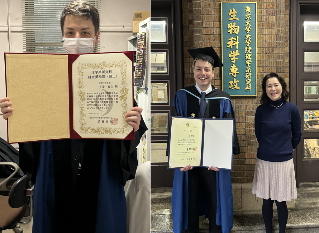 学位授与式Education Event 本日はラボにとって喜ばしい日でした。Doll君の博士号学位授与式でしたし、加えてDoll君は研究奨励賞も授与されたからです。あいにくの雨模様でしたが、ちょうど桜も満開のなか、晴れやかな日を迎えることができました。写真は秘書の青島さんとのツーショットです。