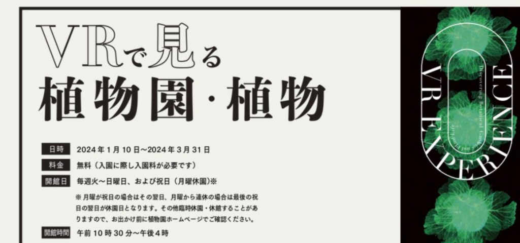 小石川植物園の後援会主催、新学術領域「植物の周期と変調」の共催で、来年1月10日より企画展「VRで見る植物園・植物 =メタバース植物学への誘い=」を開催します。 普段見ることのできない視点からの植物のかたち、そして植物園を、バーチャルリアリティやCGを使ってお見せするという企画です。小石川植物園(東京大学大学院理学系研究科附属植物園)の柴田記念館にどうぞお越しください。 なお1月14日には「感覚拡張技術の最先端で植物を体験する!」と題して当ラボの塚谷教授と、感覚拡張工学の大家・稲見教授との特別講演「メタバース植物学への誘い」および実体験ワークショップも開かれます。 奮ってご応募ください。