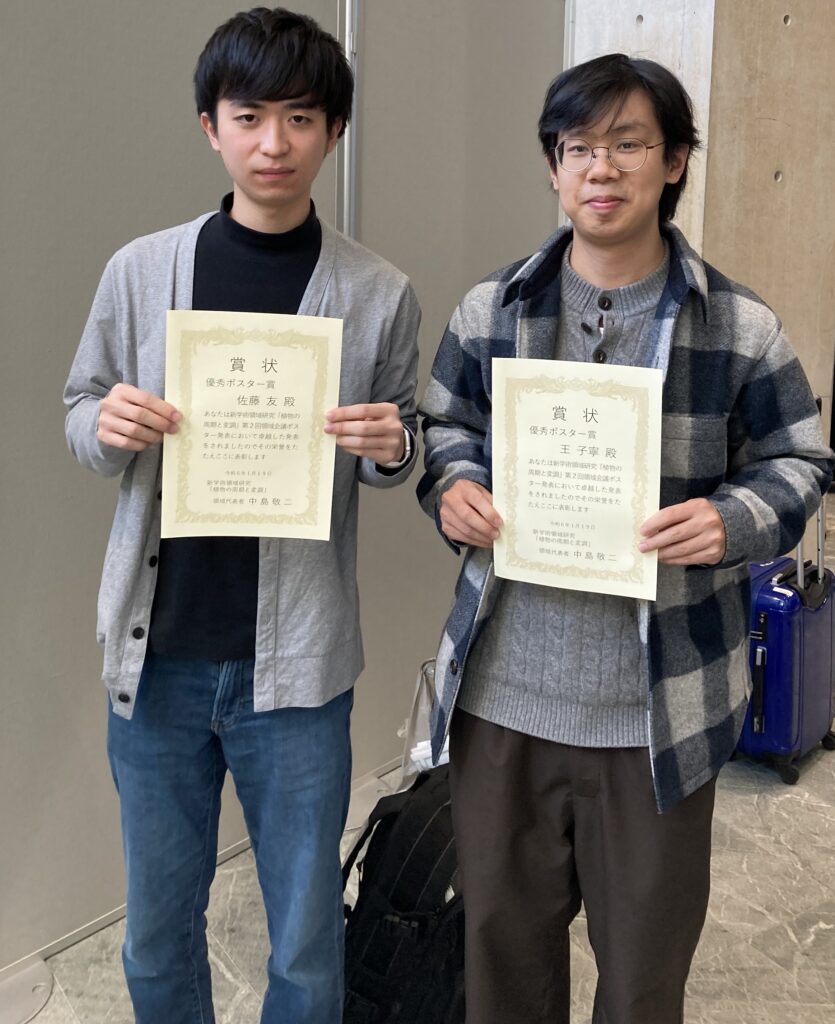 新学術領域研究「植物の周期と変調」の領域会議が、2024年1月17日から3日間、淡路島で開催されました。コロナ禍を挟んだ本領域の最後の会議が現地開催されたということもあり、多様な植物発生学・生理学研究と、それを支える最先端の解析技術について、昼夜を問わず活発な議論がおこなわれました。若手参加者のポスター発表では、参加者全員による投票で優秀ポスター発表賞が選ばれ、塚谷研究室からは、大学院生の王さんと、学部生の佐藤さんが見事受賞しました。おめでとうございます。