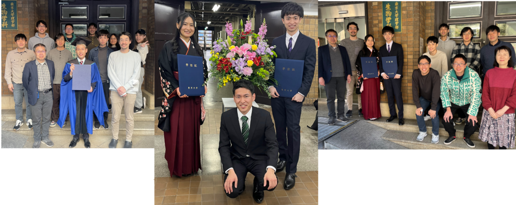 今年も春が来ました。当ラボからは上村くんが修士課程を修了、それに樋口さんと佐藤さんが学士号を取得しました。それぞれ学位授与の日の晴れ姿です。