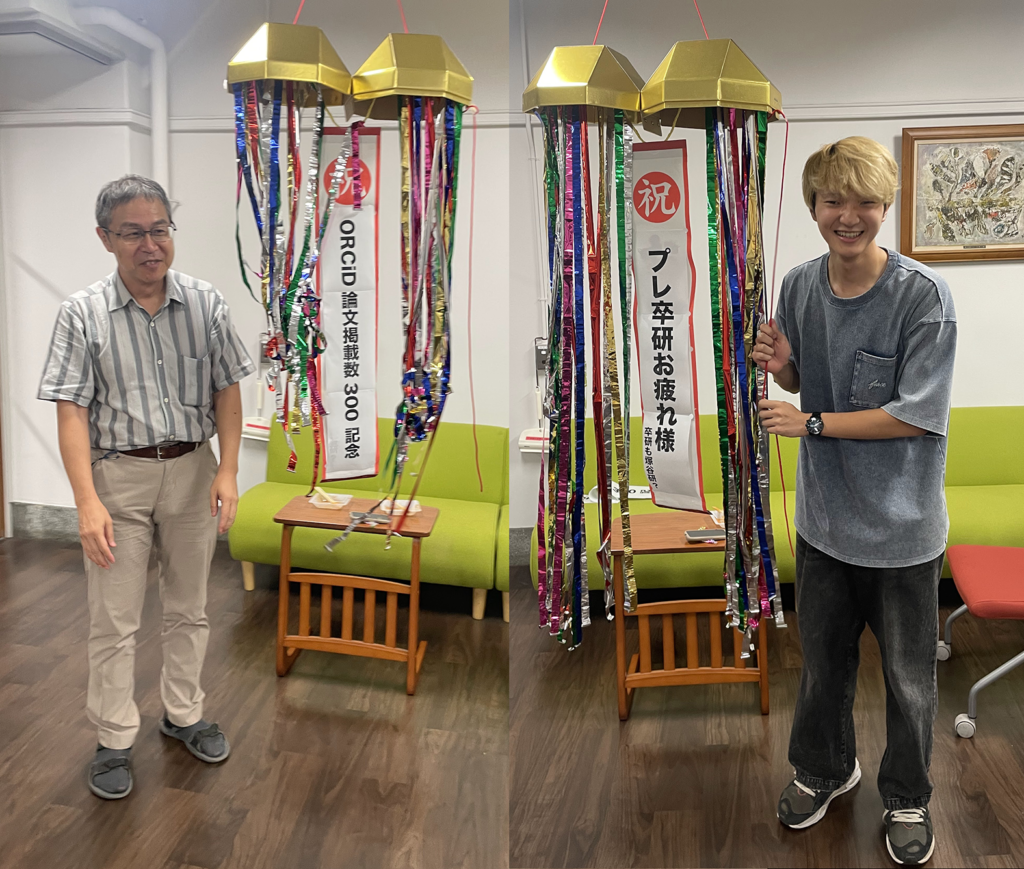 梅雨が開けた夕べ、2つのことを祝ってラボ・パーティーを開きました。一つは4年生のプレ卒研期間が終了し、その成果をまとめた発表も無事済んだことのお祝い。そしてもう一つは、塚谷教授の、英文による原著・総説論文数がORCiDデータベース上で300を突破したお祝いです。みんなで手作りした辛いものを食べながら、いよいよ到来の夏本番に備えました。