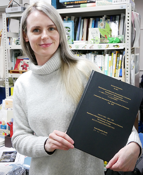 This photo shows Dr. Emma Sarath, who started her career in this laboratory firstly as a UTRIP student and then re-joined to this lab. as a graduate student. With Dr. Hoshino, who also got her Ph.D., we hope they will happily leverage their experience here.