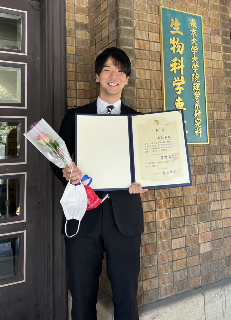 Mr Yasutake Moriyama, a master’s degree recipient from our laboratory, received his degree from Prof Tsukaya in the laboratory where he spent nearly two years. He had continued his research activities despite the restrictions imposed by the CODIV-19, and the ceremony was an event after his oral presentation at the annual meeting of the Japanese Society of Plant Physiologists.