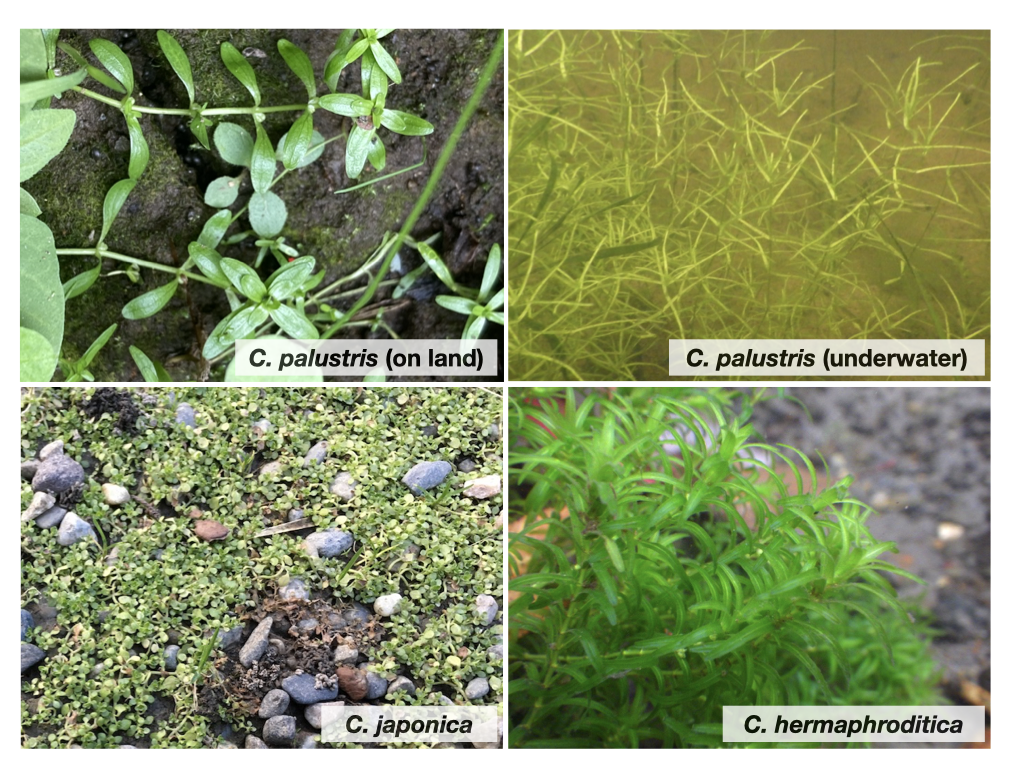 かつて水中から陸上に進出した植物の中には、再び水辺や水中に適応した、一般に水草と呼ばれる植物がいる。水辺は常に水没の危機にさらされており、水中では光合成を阻害する要素が多いため、普通の陸生植物はうまく成長できない。そのため、水草は水辺環境への適応として様々な形質を進化させてきた。たとえば、季節的または突発的に水位が変動する環境に対しては、同じ個体が水中でも陸上でも成長できる水陸両生の生活型を獲得し、その実現方法として水生時と陸生時とでは大きく異なる形態の葉を作る能力、異形葉性を進化させてきた。私達はオオバコ科の水草アワゴケ属Callitricheを用いて、異形葉の発生機構およびその進化機構を研究している。アワゴケ属は、水陸両生のミズハコベ(C. palustris)、陸生のアワゴケ(C. japonica)、完全水生のチシマミズハコベ(C. hermaphroditica)など、属内に多様な生活型の種を含み、また植物体が小さく研究室内での育成が容易なことから、発生研究に適した材料である。これまでの研究で、ミズハコベのもつ顕著な異形葉の発生の仕組みの解明に取り組んできた。また、アワゴケ属内の生活型の違いは、ガス交換器官である気孔の分布、およびその形成過程の違いと相関していることも見いだした。アワゴケ属の材料とした比較発生学的、及び比較ゲノム学的アプローチによって、植物の水環境への形態的な適応過程を明らかにしようとしている。またオオバコ科には他にも独立に水辺に進出したグループがあり、そうした植物も材料に用いて研究の展開を目指している。